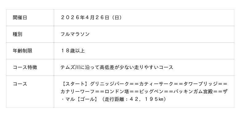 同マラソンは、例年春にイギリス ロンドンで開催され、毎年5万人以上のランナーが参加する世界有数の人気の高いマラソン大会です。走行コースは、世界遺産タワーブリッジをはじめ、ロンドン塔、ビッグベン(国会議事堂)といった歴史ある名所を巡り、ロンドンの魅力を満喫できるルートとなっています。