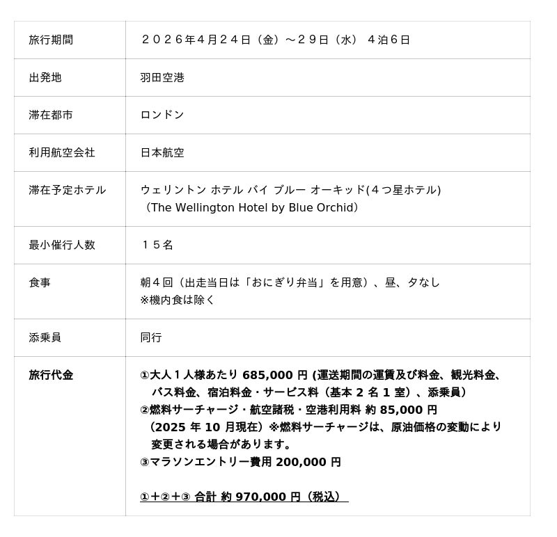 国際興業株式会社(本社:東京都中央区、代表取締役社長:黒滝寛)は、2026年4月26日(日)に開催が予定されている「ロンドンマラソン2026」の出走権が付いたツアーを企画し、
