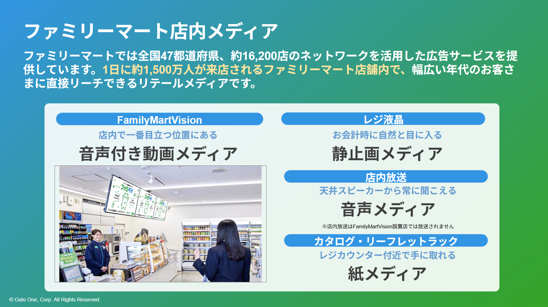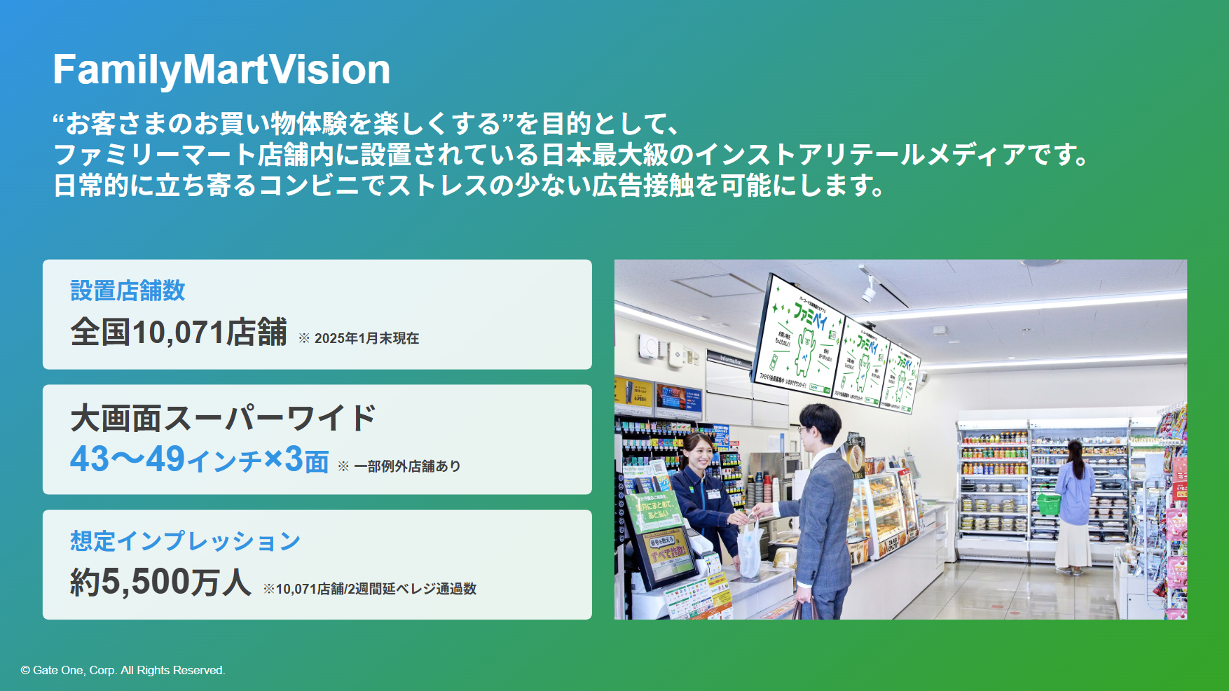 「FamilyMartVision」は、全国47都道府県のファミリーマート約10,500店舗(※)に設置され、2週間で約5,500万人の幅広い層にリーチ可能な日本最大級のインストアリテールメディアです。レジ上のデジタルサイネージだけでなく、店内スピーカーからの音声と連携することで、高い訴求力を実現しています。さらに、店頭取扱いの有無にかかわらず幅広い業種の広告出稿が可能であり、多様なクライアント企業のニーズに対応します。