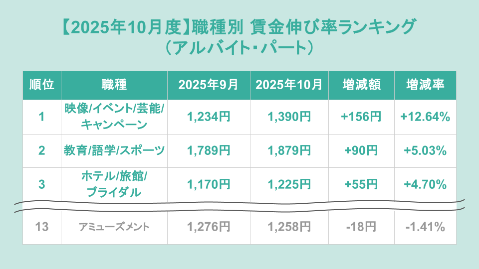 求人サイト主要9媒体から雇用形態別に分析!アルバイト・パートではイベント系が前月比+12.64%で1位【2025年10月度 職種別 賃金伸び率ランキング】