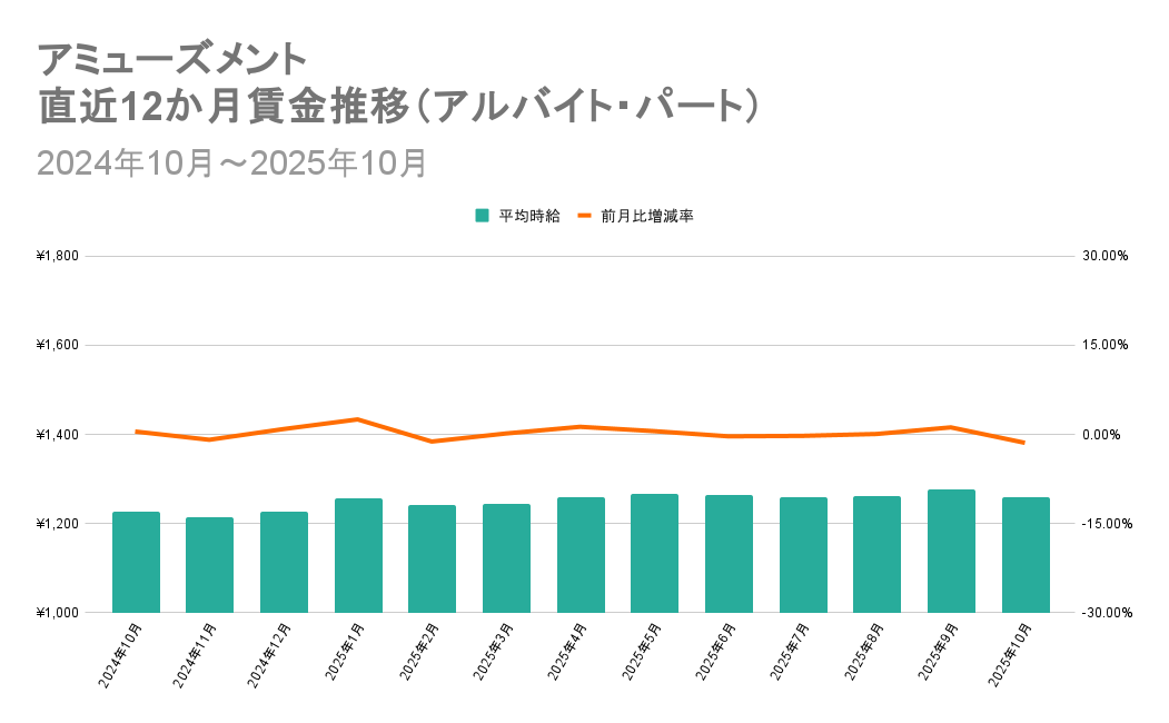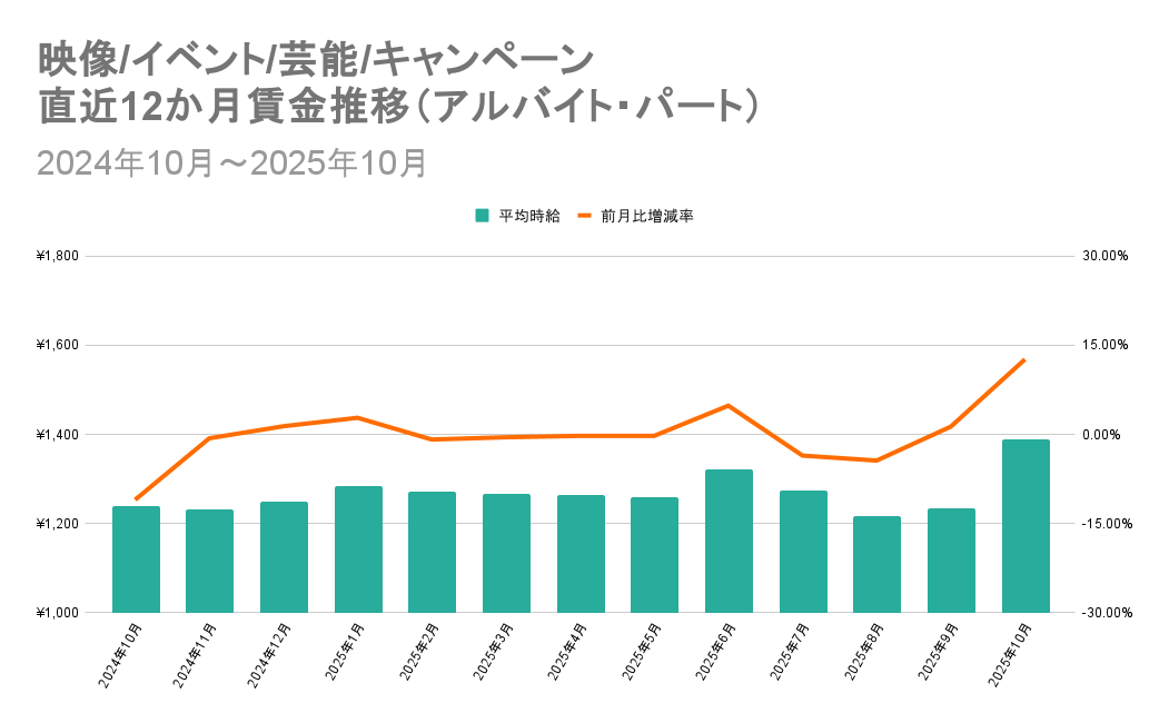 1位の「映像/イベント/芸能/キャンペーン」と13位の「アミューズメント」における直近12か月の賃金推移を比較すると、「映像/イベント/芸能/キャンペーン」では複数の企業がイベントスタッフ系の高時給求人を出稿した影響で平均時給が大きく上昇しました。