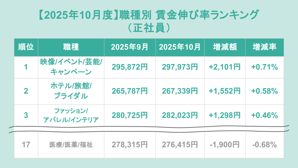 正社員の職種別賃金伸び率ランキング(前月比)トップ3は、1位が「映像/イベント/芸能/キャンペーン」(増加額+2,101円、増加率+0.71%)、2位が「ホテル/旅館/ブライダル」(増加額+1,552円、増加率+0.58%)、3位が「ファッション/アパレル/インテリア」(増加額+1,298円、増加率+0.46%)でした。