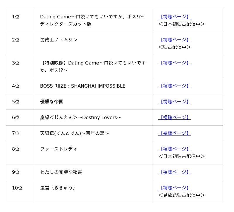 9月のLemino韓流・アジア人気ランキング発表!! 『Dating Game~口説いてもいいですか、ボス!?~』 ディレクターズカット版が3ヵ月連続で1位にランクイン!