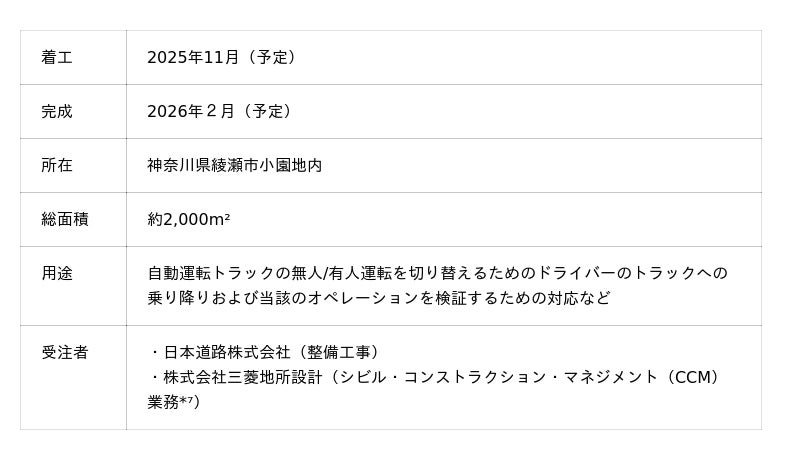 本拠点の設置にあわせて綾瀬市と連携し、完成後には、市内にある産業団地に拠点を置く企業を対象に、自動運転トラックを用いた実証への参加も呼びかける予定です。綾瀬市商工振興課は、「物流危機という深刻な社会課題に対し、今回の切替拠点の設置を通じて自動運転トラックによる幹線輸送の実現をさらに確かなものとし、市内産業活性化に繋げるため、綾瀬市もT2に最大限協力してまいります」とコメントしています。