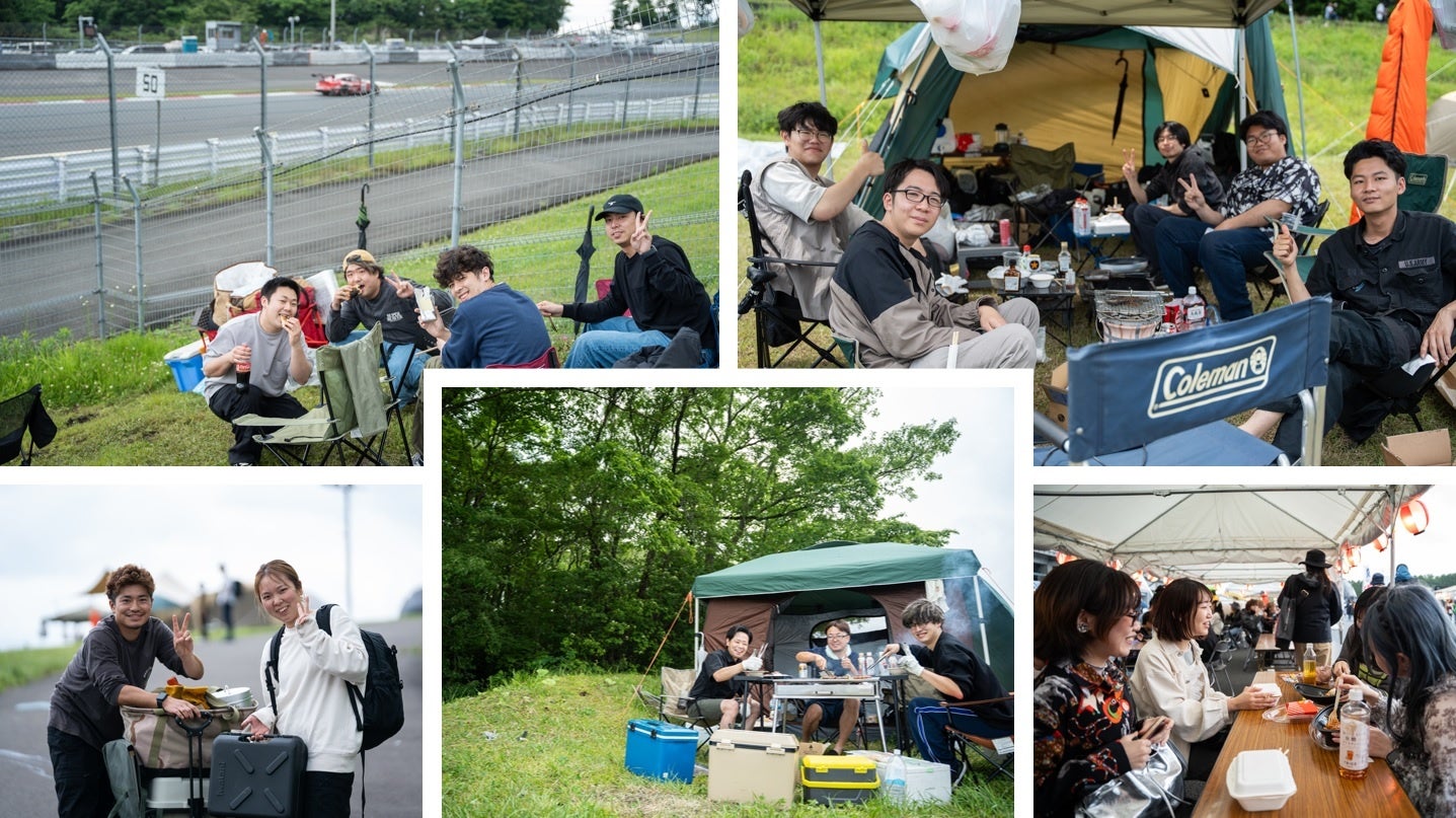 指定エリア外の芝生スペースなどにテントを設営し、晴天時は富士山の下でのキャンプやバーベキューなどを満喫いただけます。テントから、あるいはテントを拠点にし、レース前にグランドスタンドに移動して指定席などでレース観戦できるなど、レース観戦とアウトドアをお楽しみください。