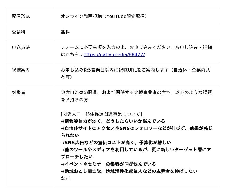 株式会社フューチャーリンクネットワーク(本社:千葉県船橋市、代表取締役:石井丈晴、以下FLN)は、同社が運営する地域・関係人口・移住促進専門メディア「Nativ.media(ネイティブ・メディア)」において、自治体および地域事業者向けの動画配信セミナー『進化したNativ.media活用術』の視聴受付を開始しました。