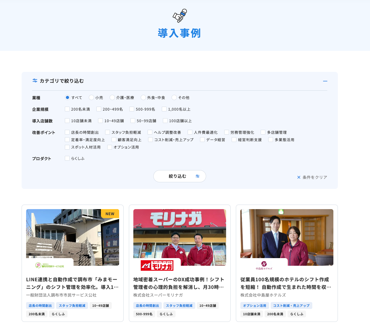 導入事例ページでは、業種・企業規模・店舗数・改善ポイントなどの条件で絞り込みができるようになり、自社と近い環境や課題をもつ企業の成功事例を簡単に見つけられるようになりました。