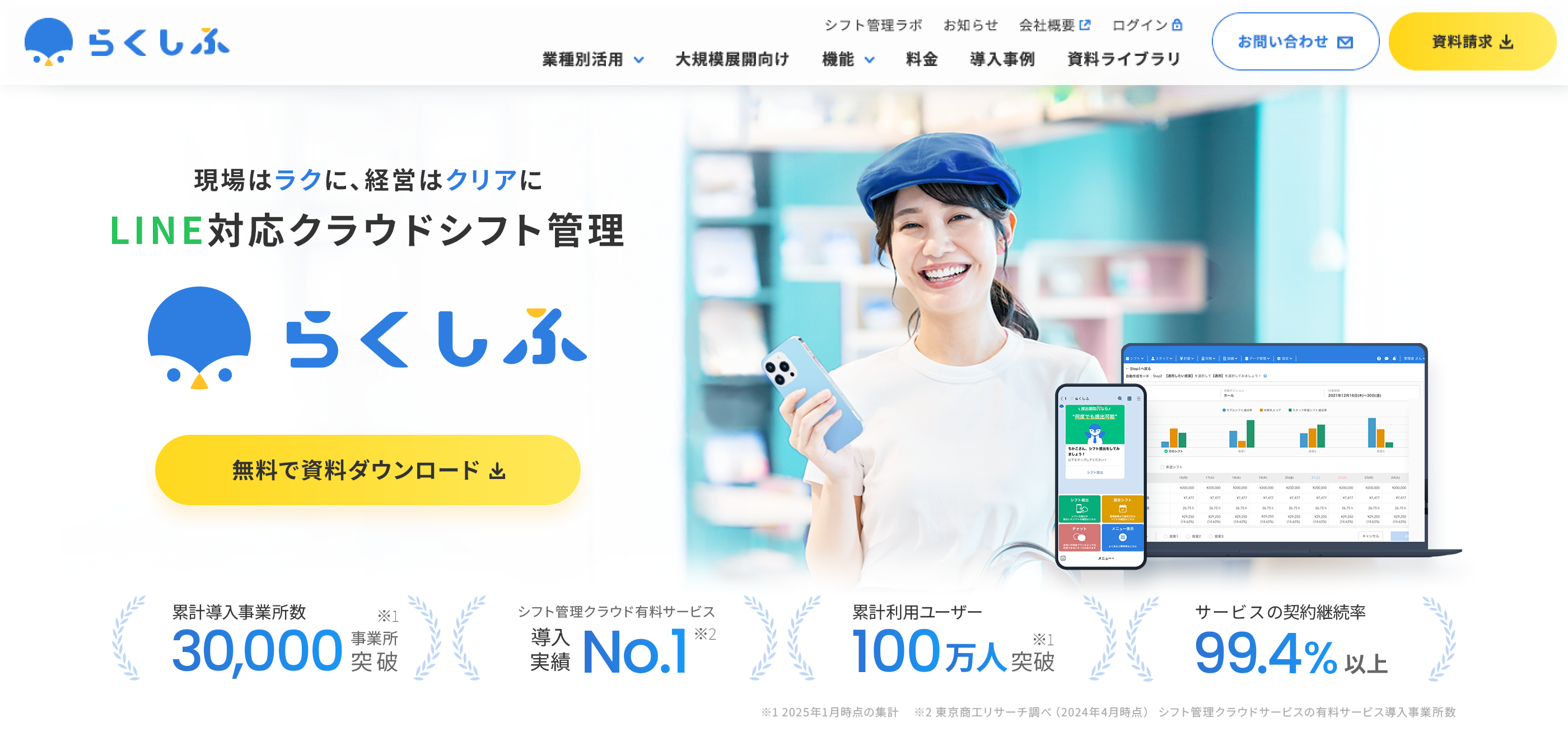 クラウドシフト管理「らくしふ」は、飲食・小売・介護・医療など、シフト制勤務のある多様な業界で導入が進み、導入事業所数は30,000拠点、累計利用ユーザーは100万人を突破しています。ユーザーからの声をもとに機能拡張や改善を重ねてきましたが、一方で、情報量の増加により「自社に合う機能や事例を探しにくい」といった課題も生じていました。今回のリニューアルでは、利用者の声を生かしてサイト全体の情報構造を再設計。目的に応じて必要な情報にすぐアクセスできるよう、構成・デザイン・検索性のすべてを見直しました。■ リニューアルのポイント