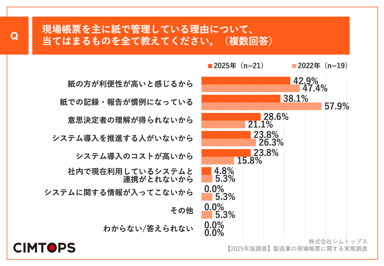 現場から挙がる理由をみると、「紙の方が利便性が高い」「紙での記録・報告が慣例になっている」といった声が中心でした。