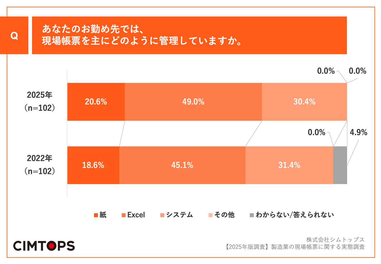製造業の現場では、デジタル化の掛け声とは裏腹に、紙やExcelによる管理が再び増えつつあります。2025年4月の調査では、現場帳票を「紙・Excel」で管理している割合が69.6%に上り、2022年調査時点(63.7%)よりも5.9ポイント増加しました。導入企業が増えているにもかかわらず、運用段階でアナログに戻る逆流現象が見られます。