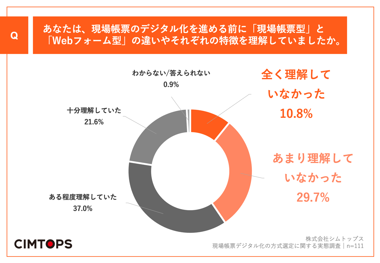 現場帳票のデジタル化を担当した製造業の現場責任者111名を対象にした調査では、4割超が「帳票型」と「Webフォーム型」の違いを理解せずに導入しており、約9割が「違う方式にすればよかった」と回答しました。多くの現場では、紙やExcelをそのままデジタル化する「帳票型」と、シンプルな入力画面を構築する「Webフォーム型」という二つの方式が存在します。しかし、その違いが明確に共有されないまま、ベンダー任せ・スピード優先で選定が進むケースが少なくありません。結果として、業務特性に合わない仕組みが導入され、現場が使いにくさを抱える構造が生まれています。