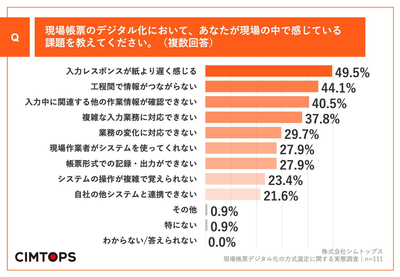 実際に、現場がデジタル化後に感じている課題として最も多かったのは「入力レスポンスが紙より遅く感じる」(49.5%)。続いて「工程間で情報がつながらない」(44.1%)、「入力中に関連情報を確認できない」(40.5%)など、業務の流れとシステム設計の不一致が上位に挙がりました。