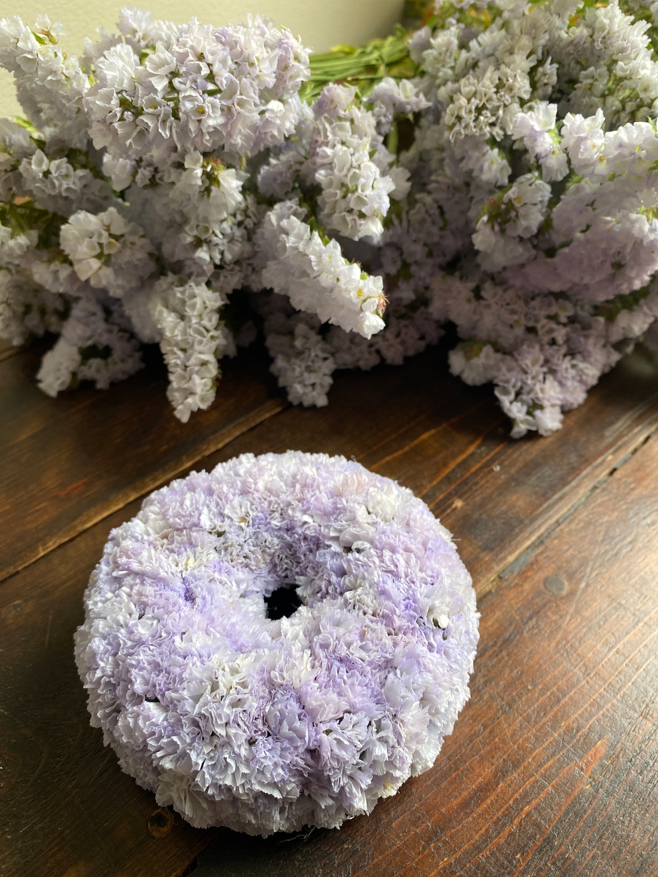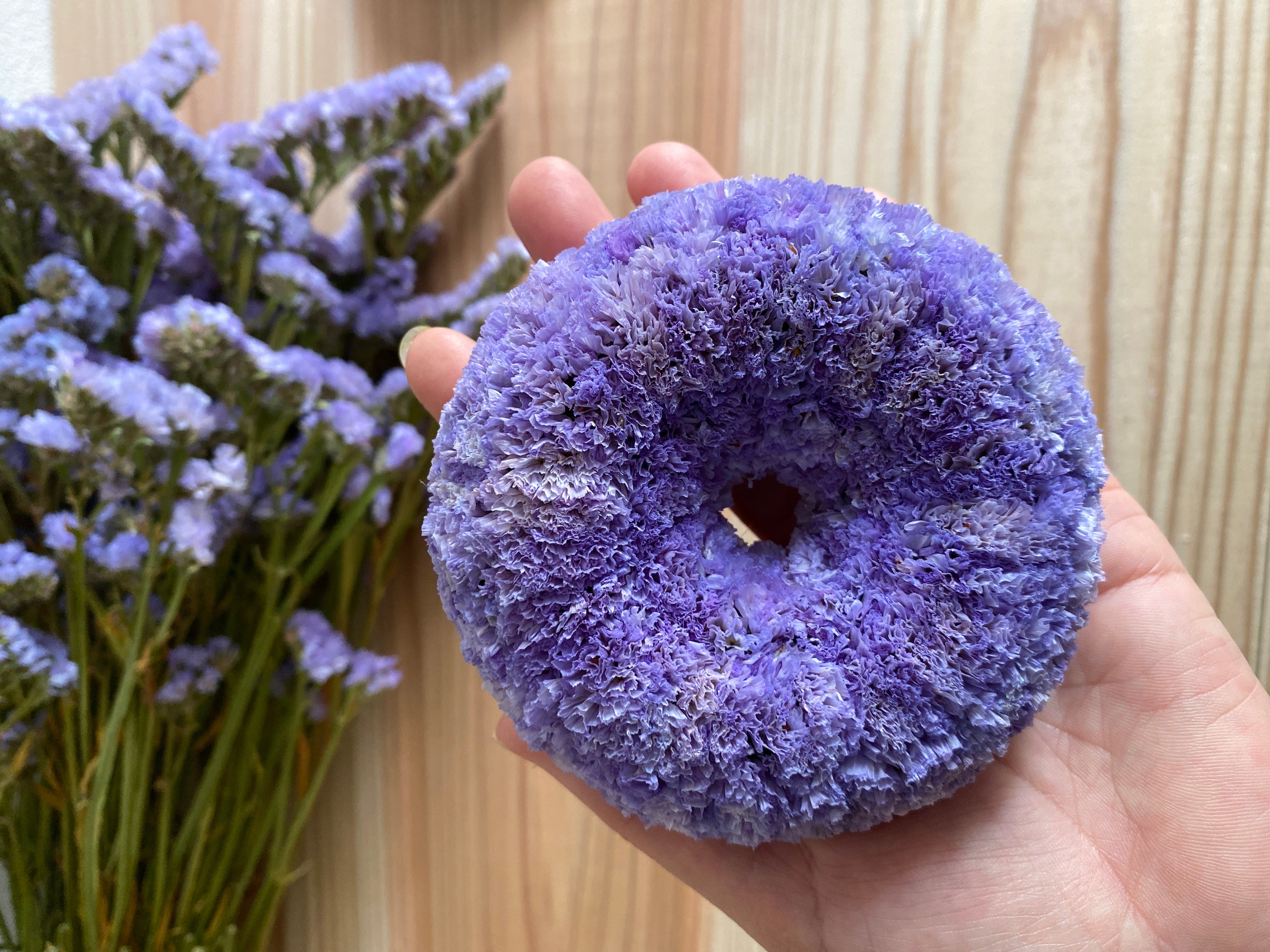 上質なオーダーメイドギフトを得意とする日本のブランド。スターチスのドライフラワーを高い密度でアレンジした、カラフルなドーナツのようなクリスマスリース。