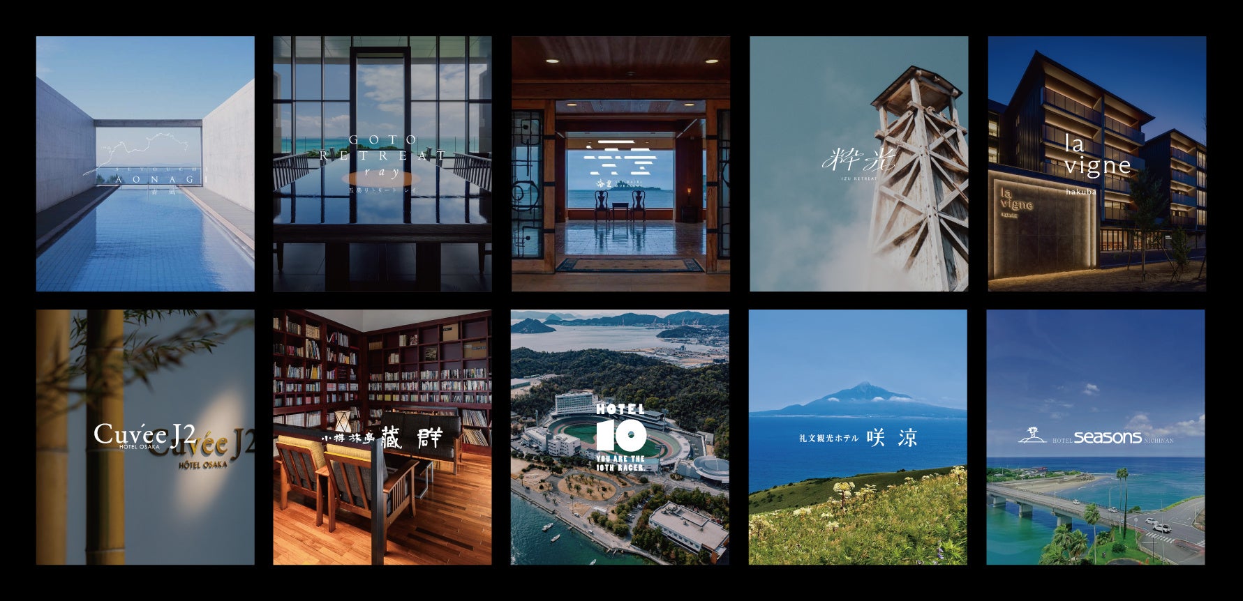 代表的な施設には、地方や離島で展開している「瀬戸内リトリート 青凪」や「五島リトリート ray」などのリトリートコレクションをはじめ、世界初のオフィシャル・シャンパン・ホテル「Cuvee J2 Hôtel Osaka」、ホテルコンドミニアム型の「ホテル ラ ヴィーニュ 白馬 by 温故知新」、さらにはスタジアム一体型ホテル「KEIRIN HOTEL 10」などがあります。