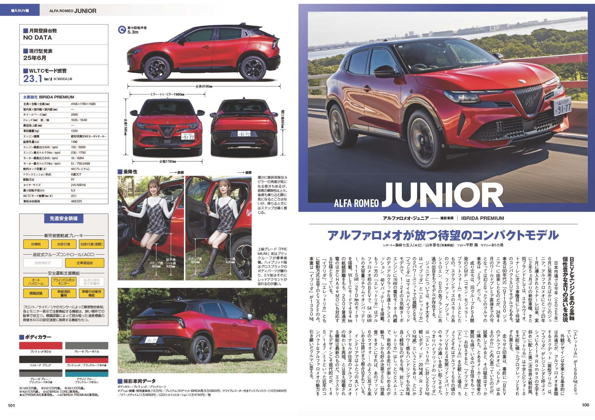 車種別フォーマットベージでは、アルファロメオ・ジュニアほか、人気の国産&輸入SUVを車種ごとに詳密解説。全車横比較しやすい定型レイアウトで、内外装や試乗の印象がチェックできます。