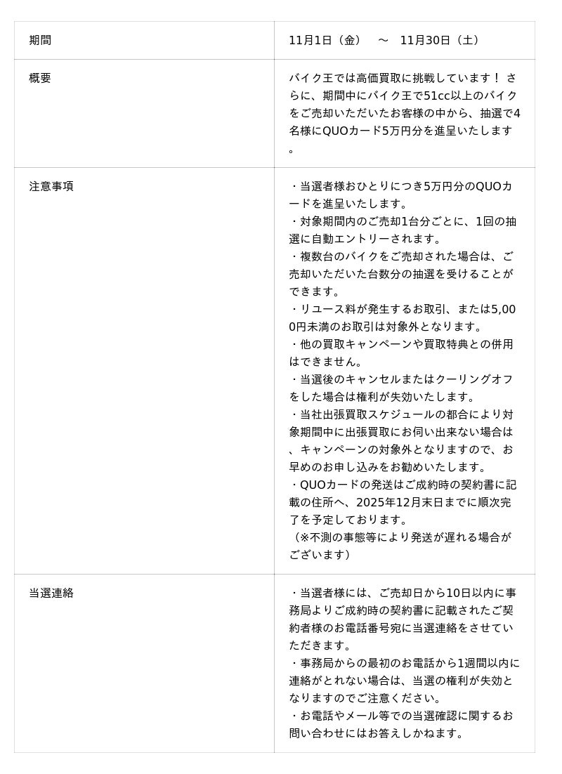 買取サービスでは、期間中に51cc以上のバイクをご売却いただいた方の中から抽選で4名様に5万円分のQUOカードをプレゼントいたします。