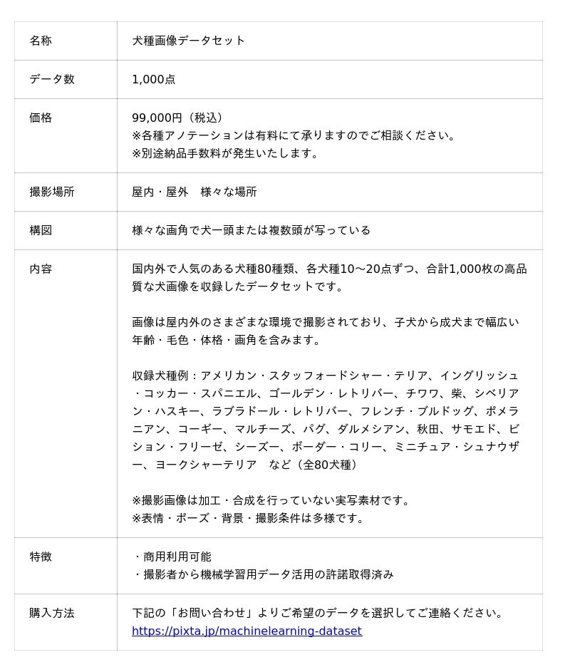 ピクスタ株式会社(東京都渋谷区 代表取締役社長:古俣大介、東証グロース:3416)が運営する写真・イラスト・動画・音楽素材のマーケットプレイス「PIXTA(ピクスタ)」は、「機械学習用画像・動画データ提供サービス」として、「犬種画像データセット」を販売いたします。