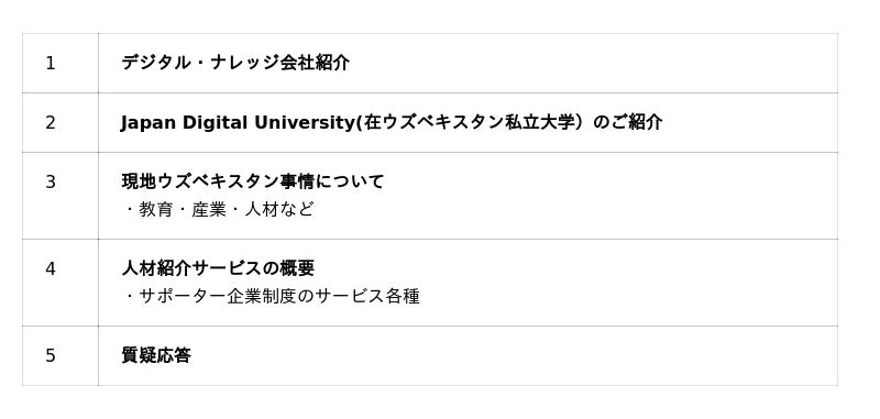 2020年にデジタル・ナレッジの100%子会社としてウズベキスタンに設立し運営している正式な私立大学です。ウズベキスタンにあるサテライトキャンパスをJDUと呼びます。ウズベキスタンの学生は、当大学にて日本語、ITエンジニアスキル、日本就業素養のほか、提携している日本の大学の授業にオンラインで参加し、試験を経て単位取得でき、最終的に日本とウズベキスタン両国の学位を取得することも可能です。卒業時には日本企業への就職を目指し、勉学に励む学生がたくさん入学しています。▼詳細はこちら