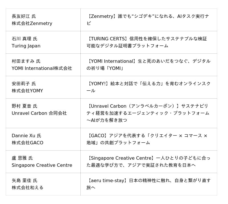 審査員にはPlug and Play JapanのRebecca Chai氏、Women in TechのRebecca Takada氏を迎え、グローバル市場に挑む起業家の可能性を探ります。