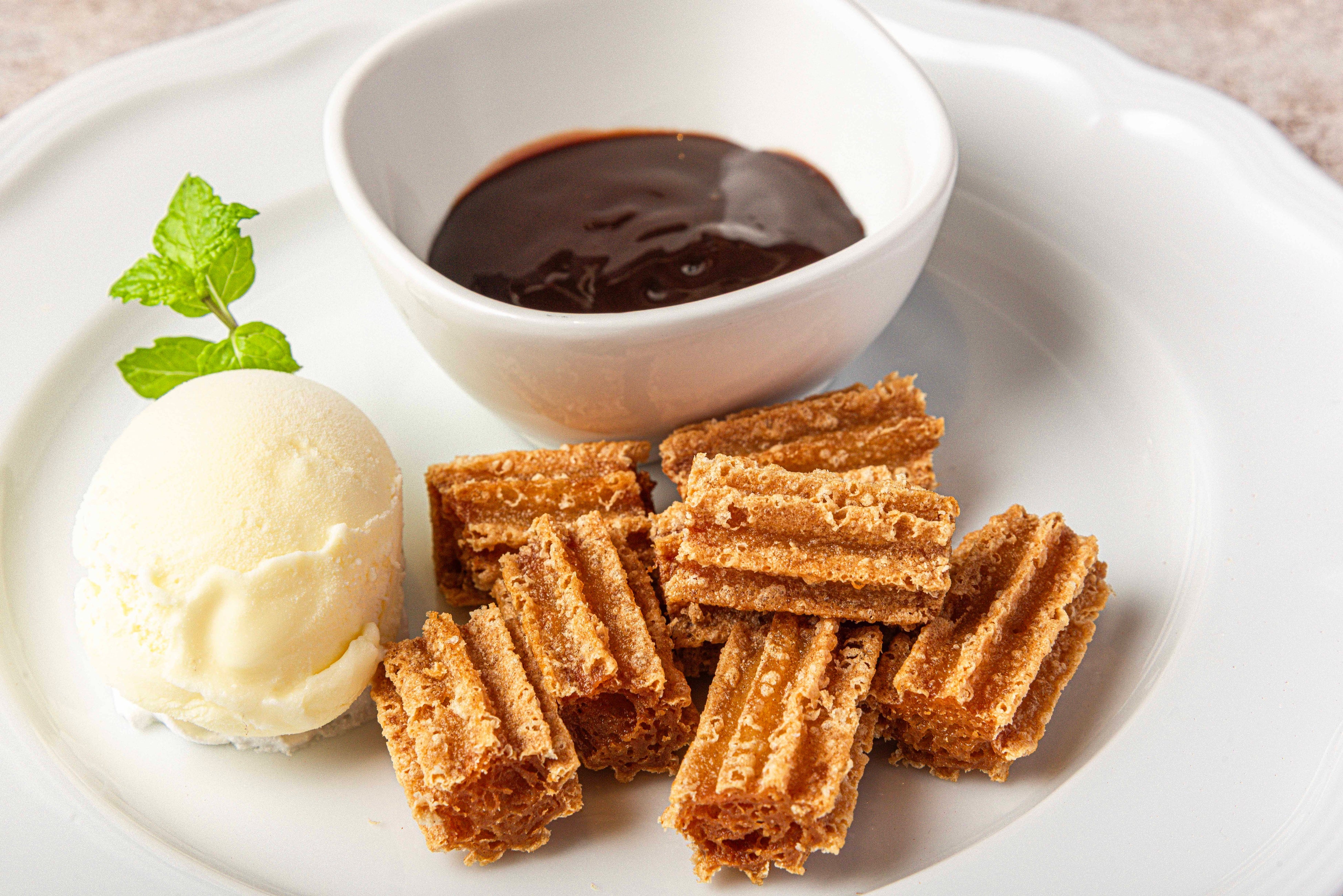 揚げたてチュロスとバニラアイス ホット チョコレートソース添え