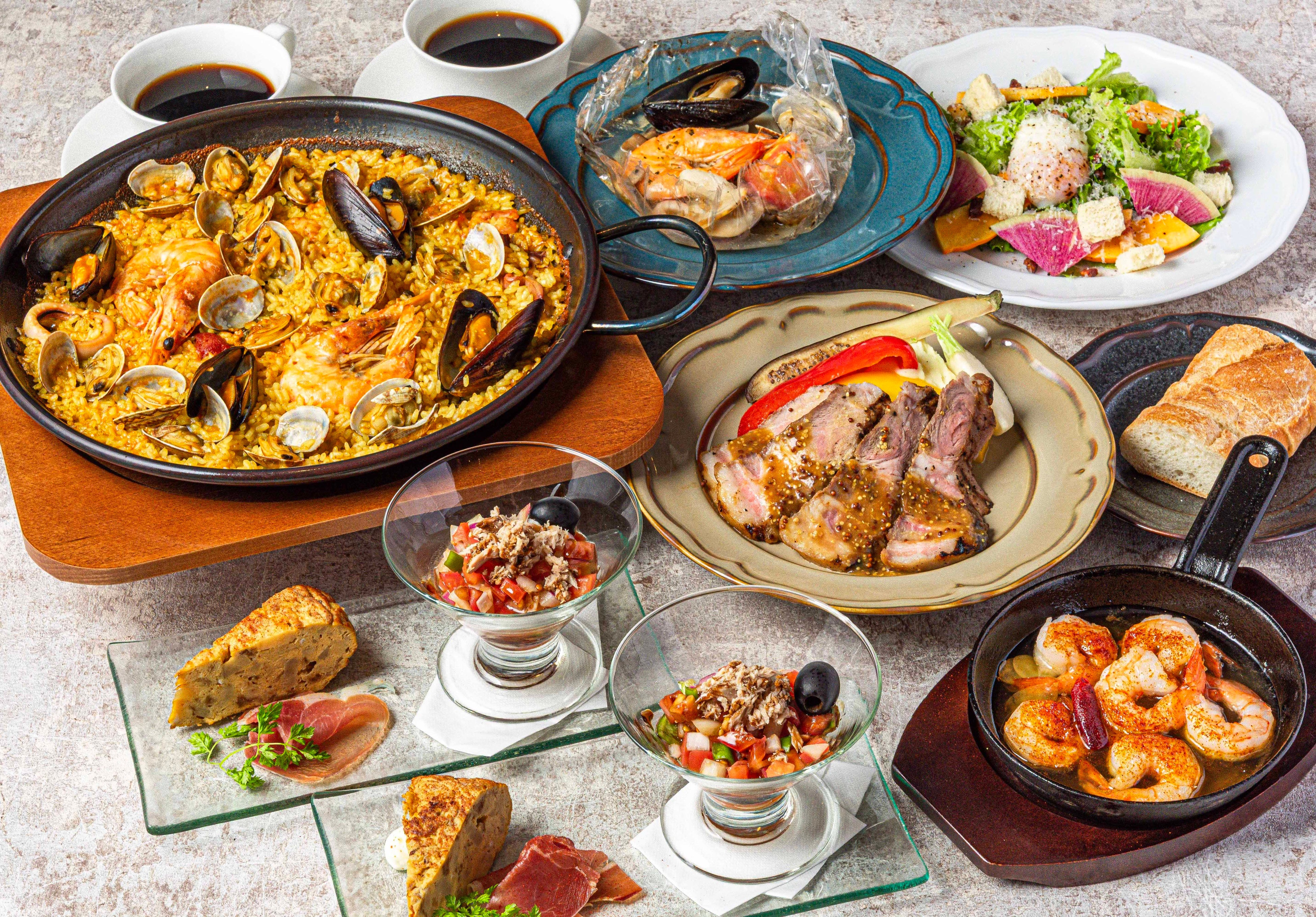 看板料理の「パエリア」を中心に、ご家族でもシェアしやすいメニュー構成となっており、お子様向けのセットメニューや、カフェタイムに楽しめるデザートも展開しています。店内は、若いカップルやファミリーが落ち着いて会話や食事を楽しめるゆったりとした空間設計が特徴です。