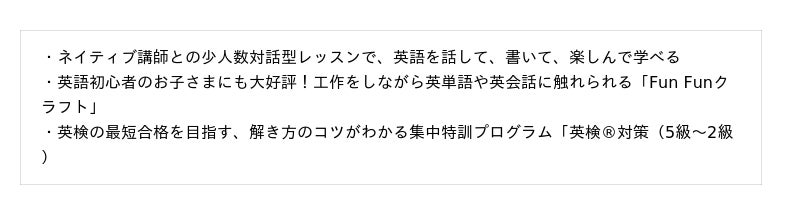 ネイティブ講師と日本人講師による少人数レッスンと自然に英語が身につく独自のカリキュラムを特長とした子ども向け英語・英会話スクール。