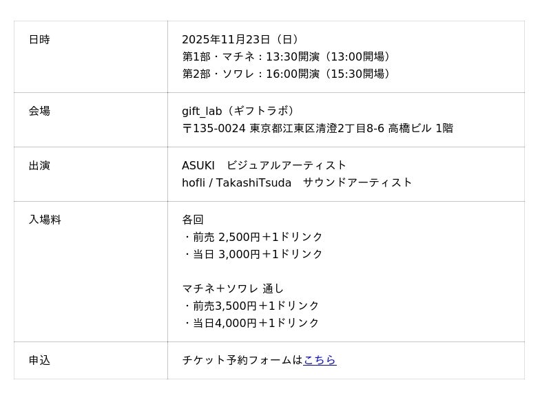 このたび、ビジュアル・アーティスト ASUKIと、サウンド・アーティスト hofli / TakashiTsudaが共演し、演奏とドローイングの即興セッション「ふれあう面、とけあう線」を11月23日(土)、東京・清澄白河のgift_labにて開催いたします。