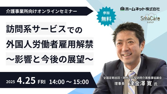 ホームネット株式会社(東京都中野区、以下当社)が提供する定期巡回・随時対応型訪問介護看護(以下、定期巡回・随時対応サービス)向け業務支援システム「SmaCare(スマケア)」は、訪問系サービスにおいて2025年4月に解禁される“外国人労働者”の雇用について、2025年4月25日(金)14:00 ~ 15:00に無料オンラインセミナーを開催いたします。