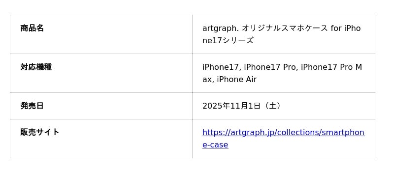 プロの写真家やクリエイター向けの高品質なプリントサービスを手掛ける株式会社PHOTOPRI(所在地:東京都板橋区、代表取締役:松邑佑太)が運営するアートポスター販売サイト「artgraph.jp」は、2025年11月1日(土)より、最新のiPhone17シリーズに対応したオリジナルスマホケースの販売を開始いたします。