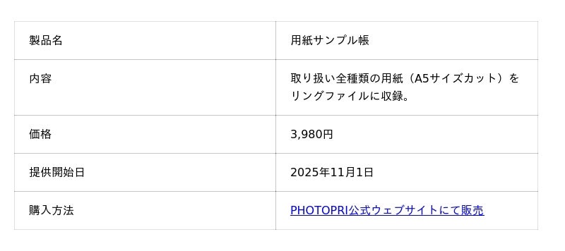 写真展・美術展品質のプリントサービスを提供する株式会社PHOTOPRI(本社:東京都板橋区、代表取締役:松邑 佑太)は、写真家やイラストレーターの最適な用紙選びをサポートするため、取り扱い全種類の用紙をファイリングした「用紙サンプル帳」を2025年11月1日より提供開始することをお知らせします。