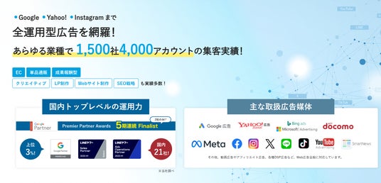 Googleが主催する「Premier Partner Awards」では、5期連続の国内ファイナリストに選出されており(※1)、また、LINEヤフー Sales Partnerでは、優れた実績を持つ代理店だけに付与される特別な認定を受けています(※2)。