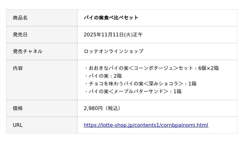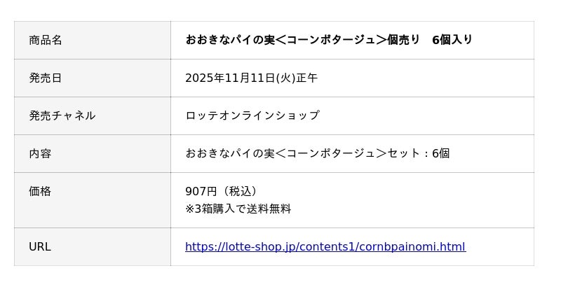 株式会社ロッテ(東京都新宿区、代表取締役社長執行役員:中島英樹、以下ロッテ)は、ロングセラーブランド「パイの実」から、“軽食シーン”向け新商品「おおきなパイの実<コーンポタージュ>セット」を2025年11月11日(火)よりロッテオンラインショップ限定で発売いたします。本商品は、従来の「パイの実=甘いチョコ菓子」という枠を超え、食事と間食がボーダーレス化してきている昨今の食シーンに対応した新しいパイの実です。通常のパイの実の約3倍(*)の重量と約2倍の128層のパイ生地を重ねることで、1個でも満足感のある“甘じょっぱい軽食”向けとして仕立てました。