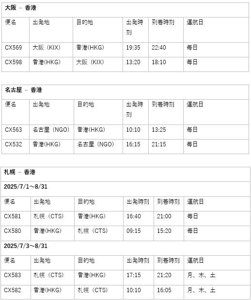 - 札幌路線:7月~8月の期間中は16時台発の夕刻便(CX581/580)が毎日運航となり、17時台の夕刻便(CX583/582)は週3便に、合計週10便になります。オセアニアやヨーロッパ方面への乗り継ぎにも便利です。