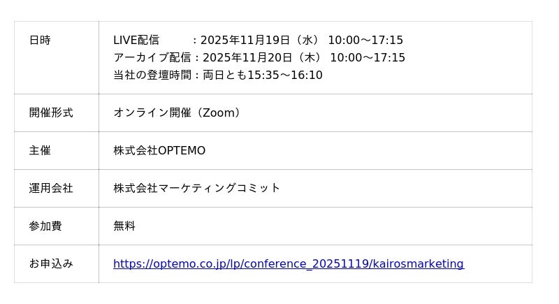 “次の一手”がデータでわかるMA+SFA一体型ツール「Kairos3(カイロススリー)」を提供するカイロスマーケティング株式会社(本社:東京都渋谷区、代表取締役:佐宗 大介、以下「当社」)は、2025年11月19日(水)開催、株式会社OPTEMOが主催するオンラインカンファレンス「The Moment 2025 AI時代の“選ばれる体験”をどう作るか? 変化する“BtoB意思決定プロセス”の最前線」に、当社取締役 COO 白井 則行が登壇することをお知らせします。
