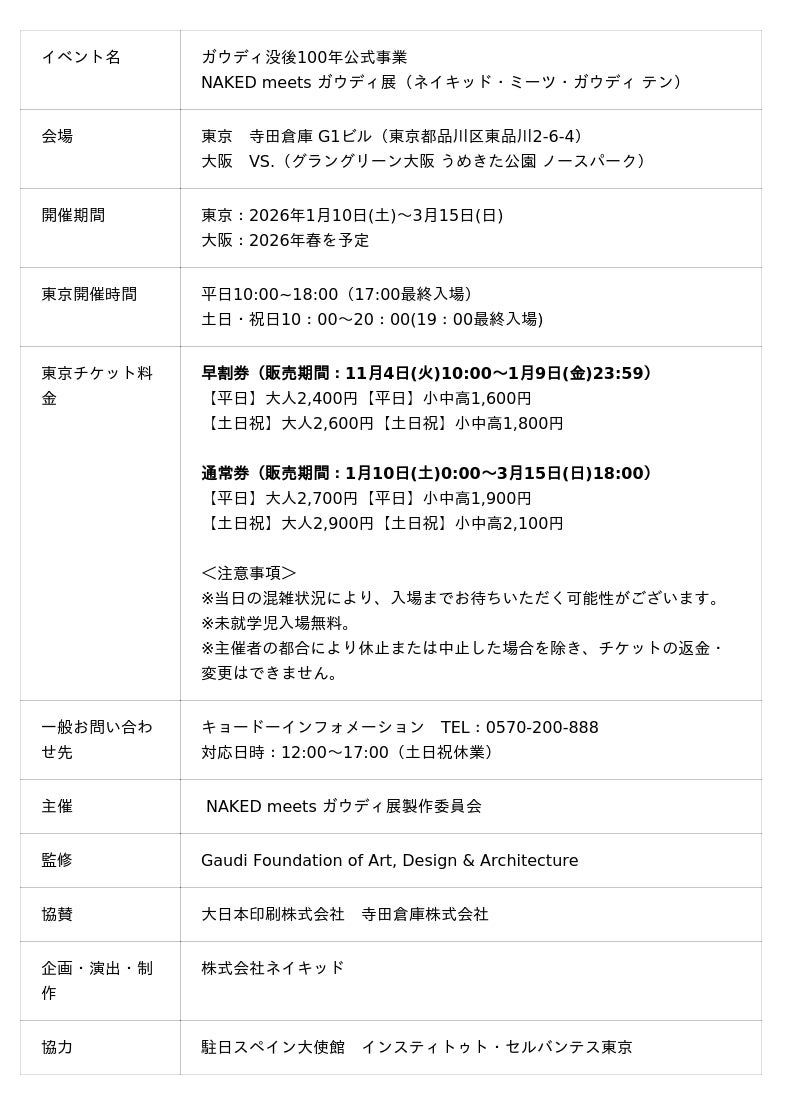 株式会社ネイキッド(英語表記:NAKED, INC./所在地:東京都渋谷区/代表:村松亮太郎)は、サグラダ・ファミリアの設計で知られる建築家アントニ・ガウディの遺産保存と継承を目的とするガウディ財団と世界初となる共同事業契約を締結しました。これにより、ガウディ没後100年を迎える2026年、公式展覧会『ガウディ没後100年公式事業 NAKED meets ガウディ展』のワールドツアーを始動いたします。その幕開けとなる東京展は、寺田倉庫G1(東京都品川区東品川2-6-4)にて2026年1月10日(土)から3月15日(日)まで開催決定。続いて、大阪のVS.(グラングリーン大阪内)での開催を2026年春より予定しています。