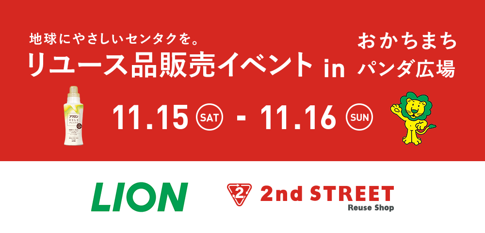 株式会社ゲオホールディングス(本社:愛知県名古屋市中区、代表取締役社長執行役員:遠藤結蔵)のグループ会社である株式会社セカンドストリート(本社:愛知県名古屋市中区、代表取締役社長:一戸綱樹)は、ライオン株式会社(本社:東京都台東区、代表取締役兼社長執行役員:竹森征之)と共同で、2025年11月15日(土)~11月16日(日)、「御徒町南口駅前広場(おかちまちパンダ広場)」にて、「地球にやさしいセンタクを。」リユース品販売イベントを開催します。