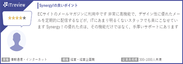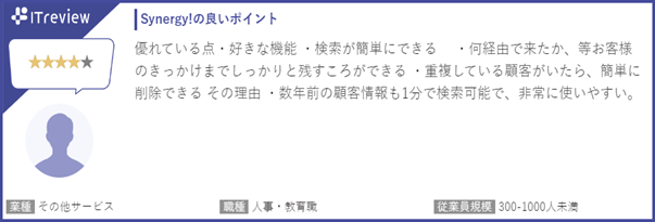 ITreviewに投稿のあったSynergy!ご利用のお客様からのレビューの一部を紹介します。