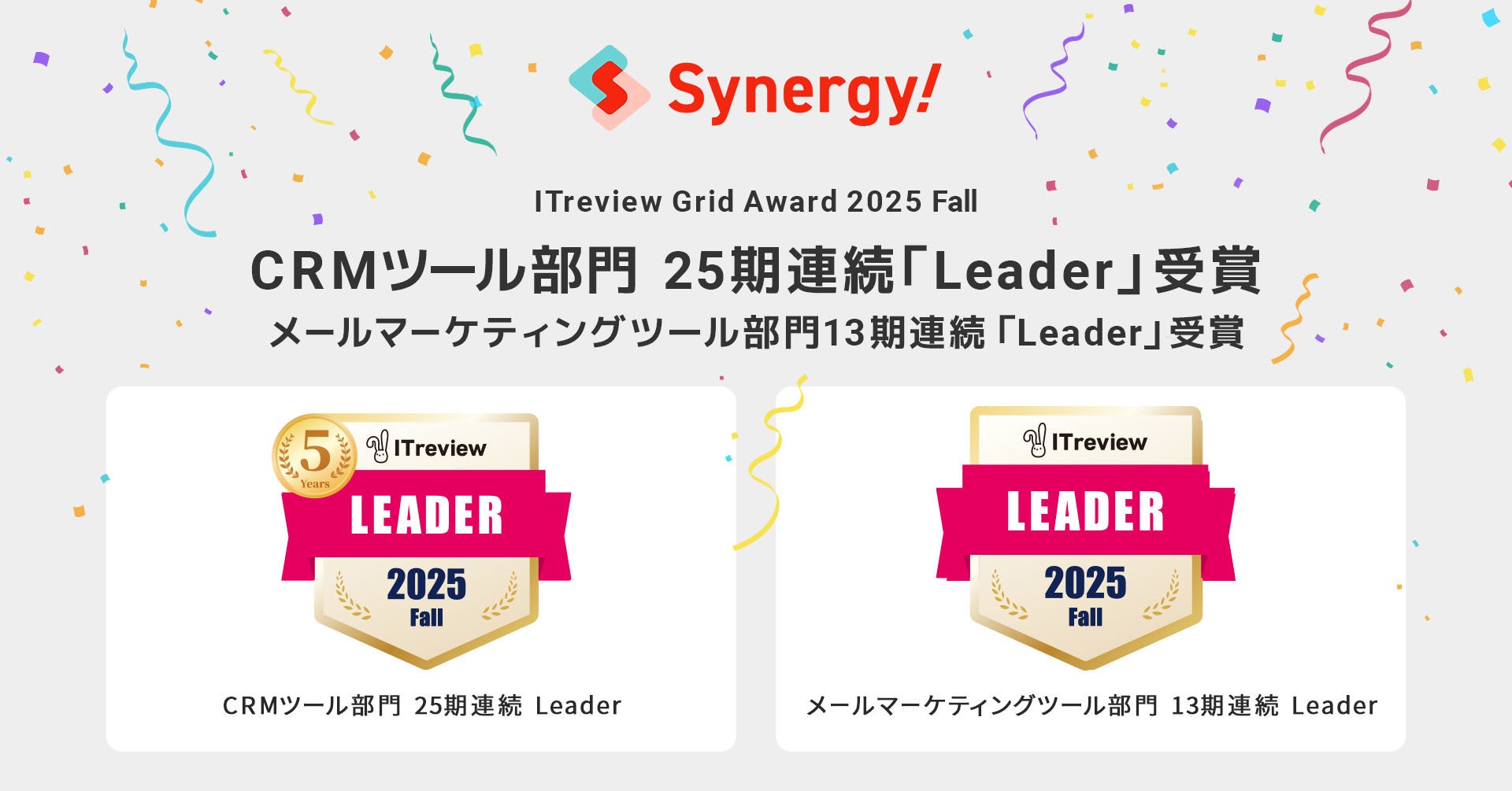 シナジーマーケティング株式会社(以下当社)は、当社が提供するマーケティングSaaS「Synergy!(シナジー)」がアイティクラウド株式会社(本社:東京都港区、代表取締役社長:黒野源太)運営のIT製品レビュープラットフォーム「ITreview(アイティレビュー)」において、満足度、認知度ともに優れた製品であると評価され「ITreview Grid Award 2025 Fall」CRMツールおよびメールマーケティングツール部門において最高位「Leader」を受賞したことをお知らせします。CRMツール部門における「Leader」受賞は25期連続、メールマーケティング部門では13期連続となります。
