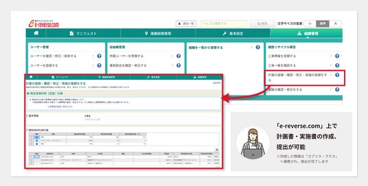 本サービスは、「e-reverse.com」上で計画書・実施書の作成、一元管理が可能となります。作成した情報は、一般財団法人日本建設情報総合センター(所在地:東京都港区、理事長:山田邦博、以下 JACIC)が提供する「コブリス・プラス」へ連携されるため、計画書・実施書の作成から提出までの業務負担が軽減されます。なお、「コブリス・プラス」において、ASP事業者との連携は当社が初となります。