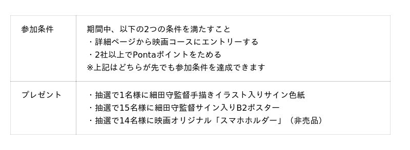 本キャンペーンには、Ponta提携社・サービスの51社以上が参加します。エントリーなしでどなたも対象となり、期間中、対象のPonta提携社・サービスの2社以上を利用して、Pontaポイントをためた方の中から、抽選で合計100万名様に、ためたポイントの最大100倍のポイントをプレゼントします。さらにキャンペーンページから「映画コース」にエントリーをした方の中から、抽選で合計30名様に、細田守監督の手描きイラスト入りサイン色紙やサイン入りB2ポスター、映画『果てしなきスカーレット』の非売品グッズをプレゼントします。