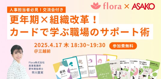 AIを活用した法人向け健康支援サービス「Wellflow」を提供するFlora株式会社は、2025年4月17日(木)に「【人事担当者必見!交流会付き】更年期×組織改革!カードで学ぶ職場のサポート術」イベントを開催いたします。本イベントは株式会社朝日広告社との共催で行います。