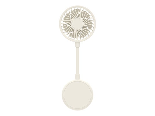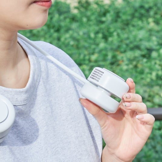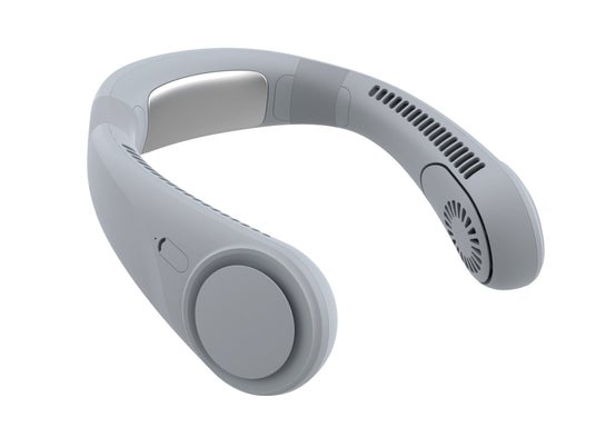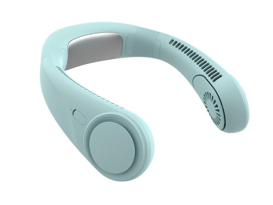 首元に冷却プレートを備え、畳んでコンパクトに収納できる首掛けタイプのハンズフリーファン。