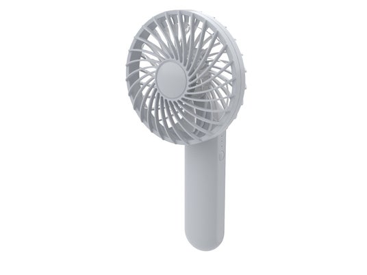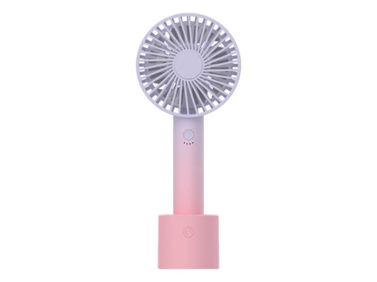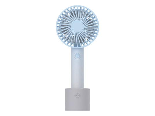 5段階の風量調整ができるハンディファン。充電しながら首振り卓上ファンとして使える回転台座つき。