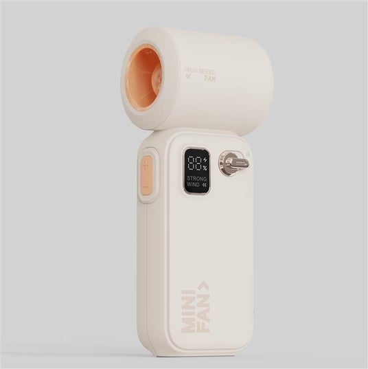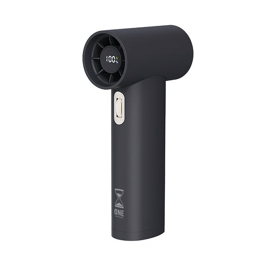 焚火などの火起こしに使う送風機「ブロワー」から着想を得た、パワフルな風を送るハンディファン。液晶パネルで風量レベルや電池残量を確認できます。