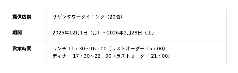「小田急ホテルセンチュリーサザンタワー」(所在地:東京都渋谷区代々木2-2-1、総支配人:宮越 真理子)内、「サザンタワーダイニング」では、若手・中堅の調理課社員を対象にした第6回社内料理コンテストで選ばれた料理とデザート全3品を、2025年12月1日(月)から2026年2月28日(土)まで期間限定で提供いたします。