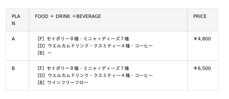 ※PRICE(価格)には消費税・サービス料が含まれております。