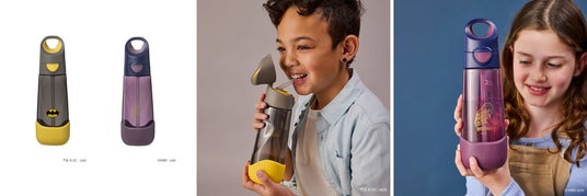 軽量で丈夫なトライタン素材を採用したボトル。「バットマン」デザインは、スポーツシーンでも映えるシャープなカラーリング。「ハリー・ポッター」デザインは、ネイビー×パープルの上品な組み合わせで、シンプルながらも特別感のあるデザインです。