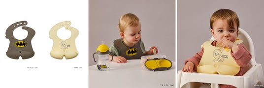 お食事タイムをもっと楽しく!「ルーニー・テューンズ」のかわいいキャラクターたちや、クールな「バットマン」デザインのシリコンビブが登場。柔らかくて洗いやすいシリコーン素材を使用し、お子さまの食事を快適にサポートします。