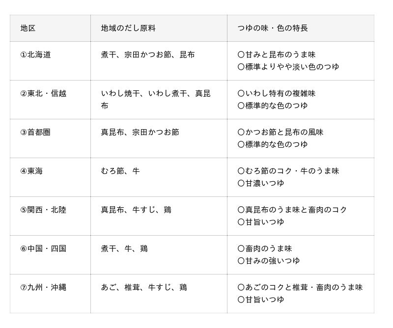 セブン‐イレブンのおでんつゆは、全国7つの地域ごとに食文化に合わせて設計。北海道の「煮干」、東北・信越の「いわし」、関東の「昆布」、東海の「牛」、関西・北陸「牛、鶏」、中国・四国の「煮干、牛」、九州・沖縄の「あご」と、地域の味を生かしただし原料を使用しています。
