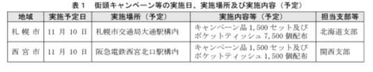 11月10日「エレベーターの日」の活動として、表1に示す場所で、エレベーター、エスカレーターの安全利用リーフレット、全国統一ポスターをデザインしたポケットティッシュ及び蛍光ペン(以下「キャンペーン品」という。)等を支部関係者又は鉄道事業者のご協力を得て配布し、エレベーター、エスカレーターの安全・安心な利用を幅広く呼び掛けます。